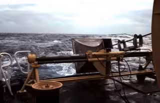 Vista desde la popa del barco mientras remolca el largo conjunto horizontal de hidrófonos. Se puede ver el cable de remolque pasando por la bocina de metal en la popa. El conjunto de hidrófonos está a cientos de metros detrás y a 200 de profundidad